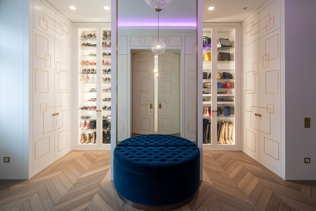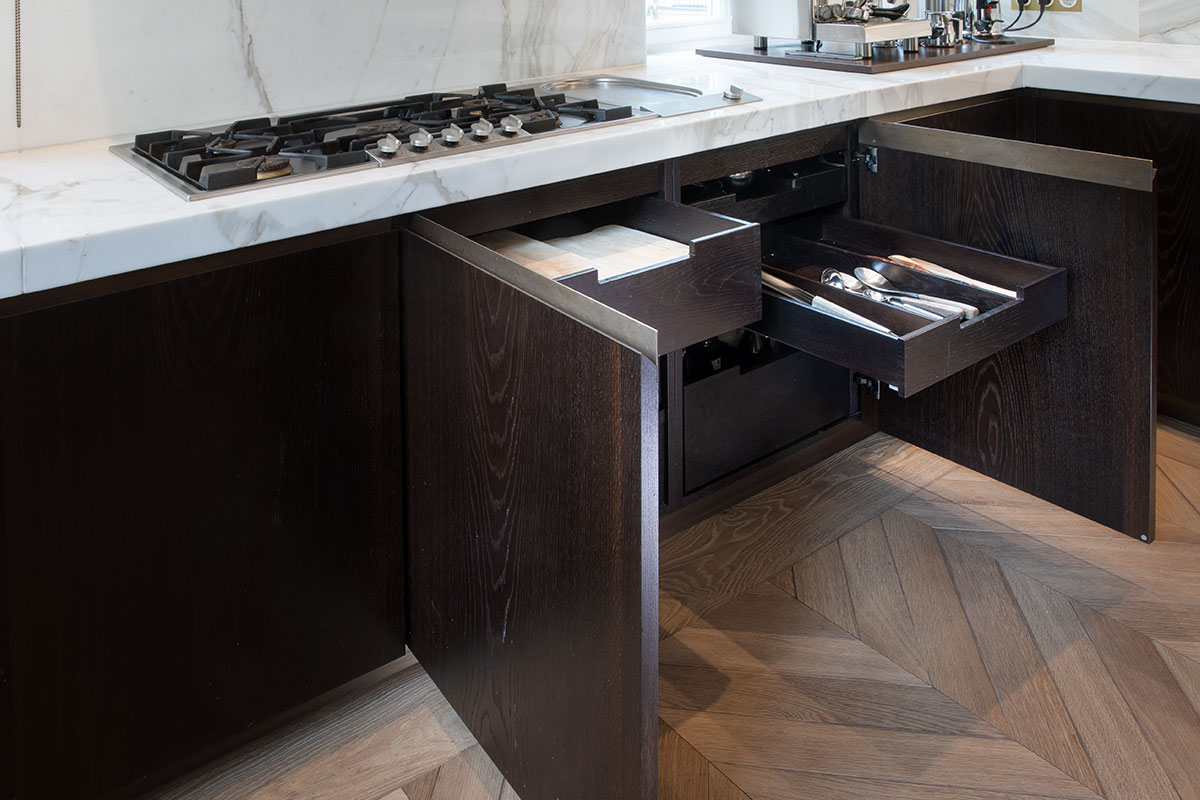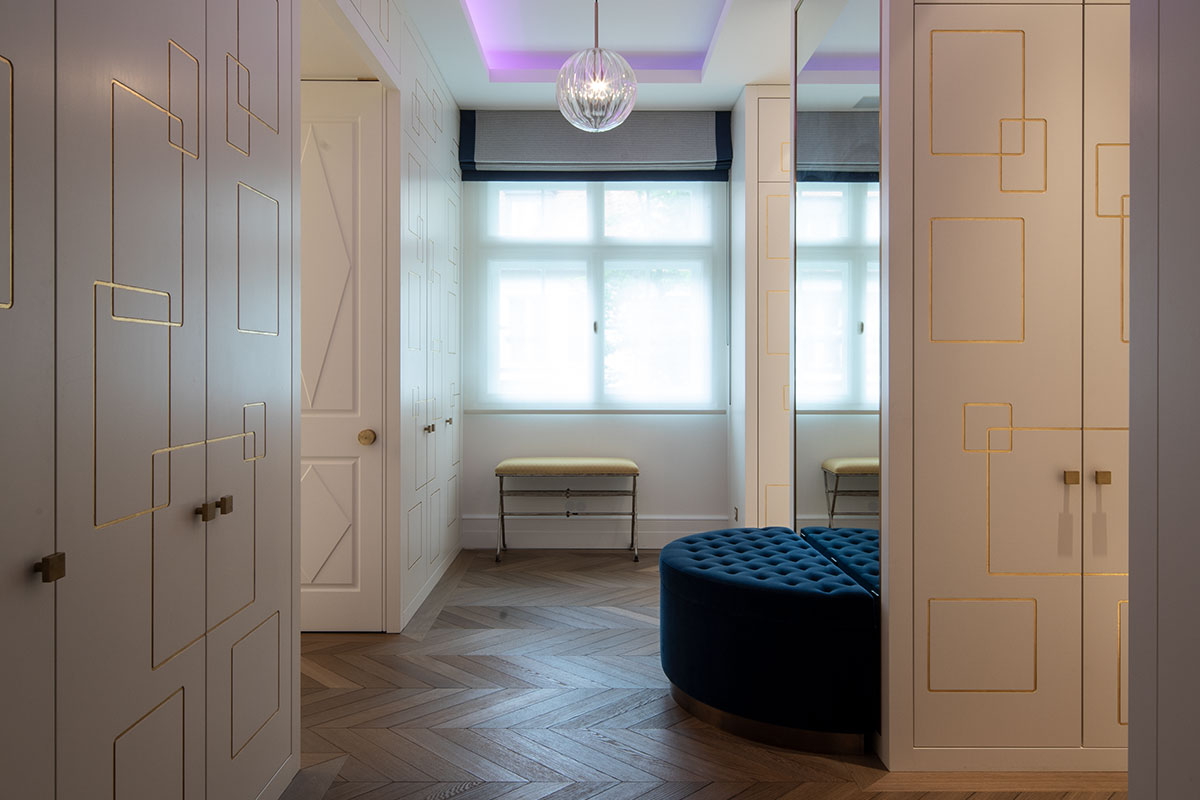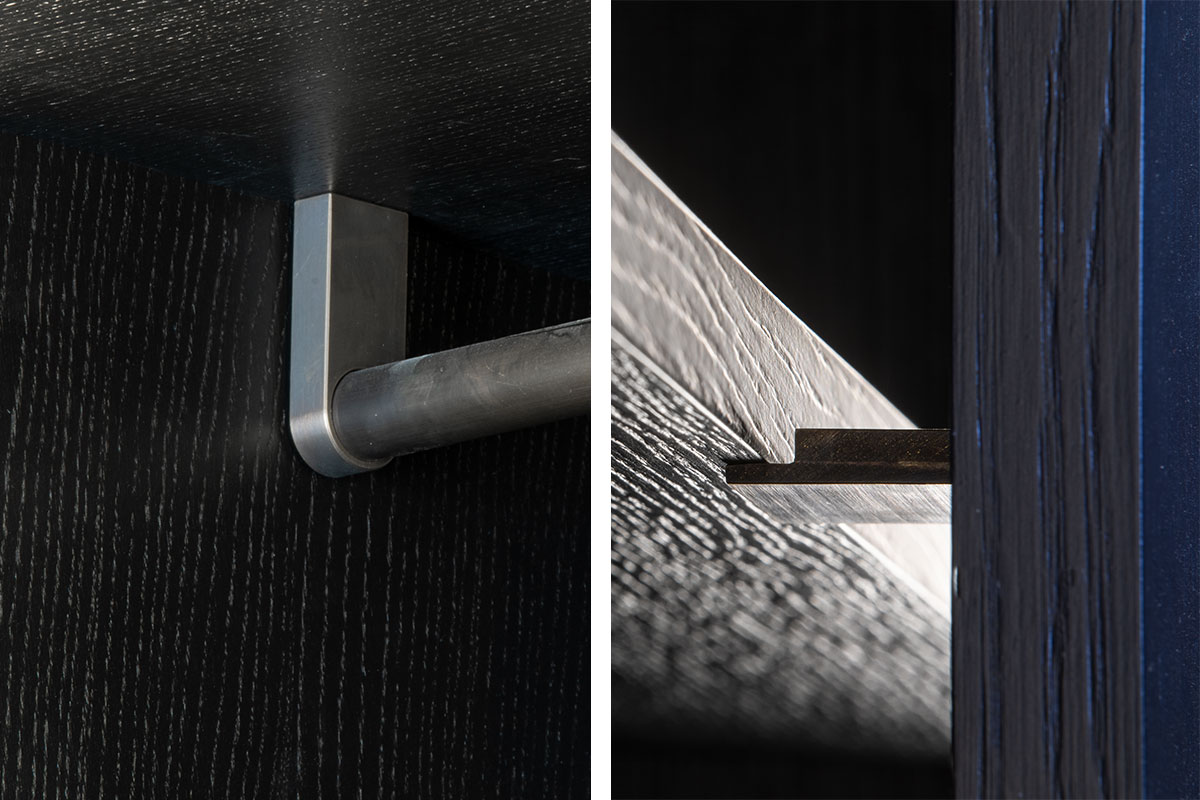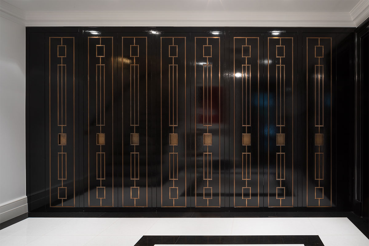 In Messing brüniert, extra gefertigte Details für Möbel in brüniertem Messing, Einlegearbeiten in Blattgold, sämtliche Anschlüsse / Möbel / Bodenfriese / Stuck aufeinander, Pinselstrichlackierung, Möbel raumhoch / als Teil der Räume integriert, Türleibungen teils in Möbel integriert, Furnierarbeiten im Quadratmuster