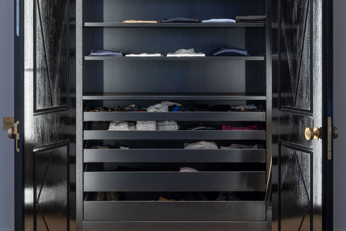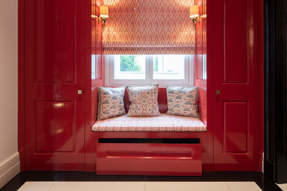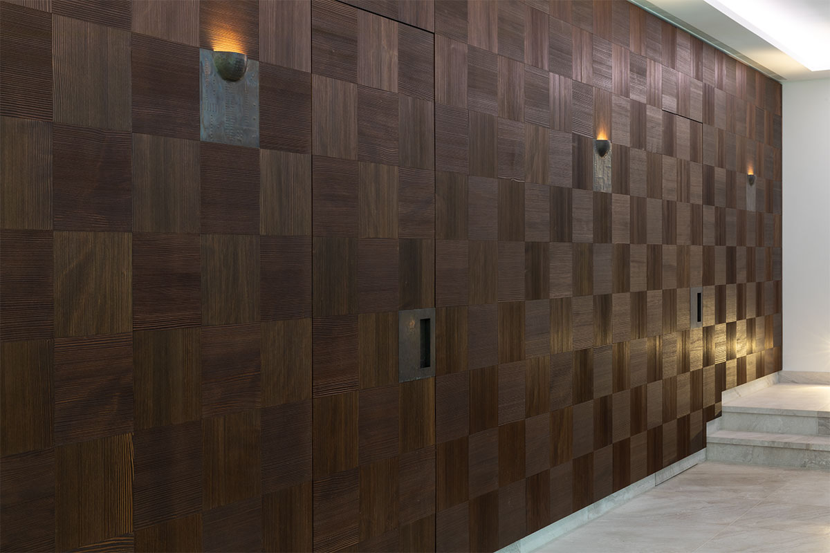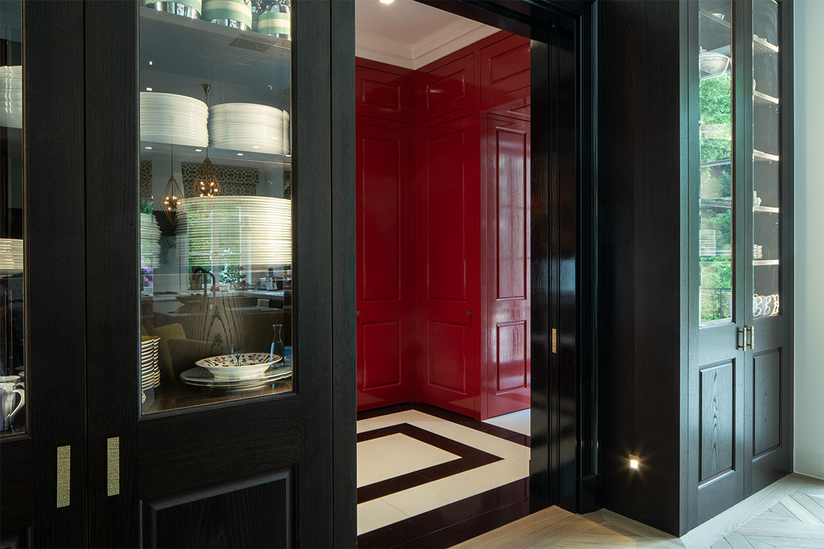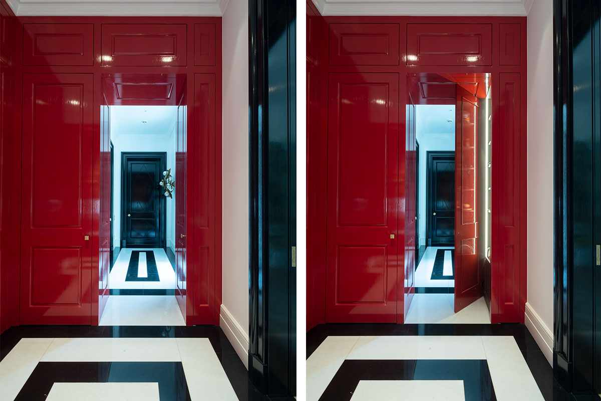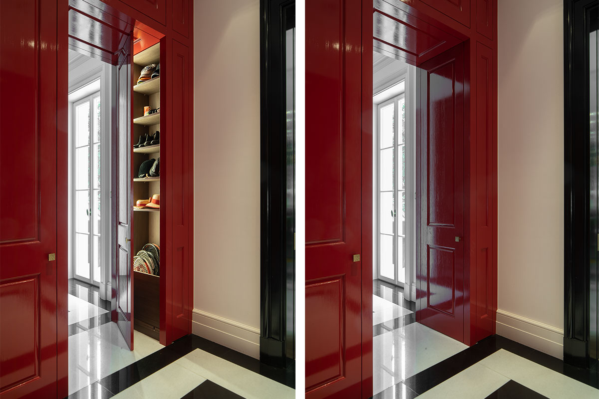 In Messing brüniert, extra gefertigte Details für Möbel in brüniertem Messing, Einlegearbeiten in Blattgold, sämtliche Anschlüsse / Möbel / Bodenfriese / Stuck aufeinander, Pinselstrichlackierung, Möbel raumhoch / als Teil der Räume integriert, Türleibungen teils in Möbel integriert, Furnierarbeiten im Quadratmuster